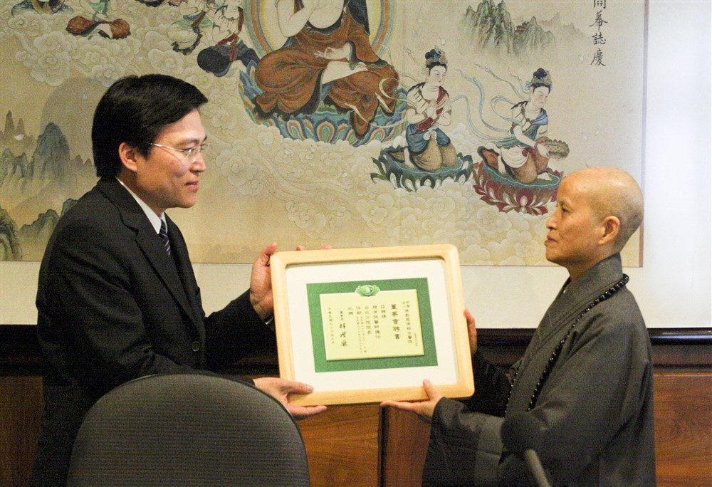 二○○八年三月證嚴上人頒發台北慈濟醫院院長聘書予趙有誠院長。
