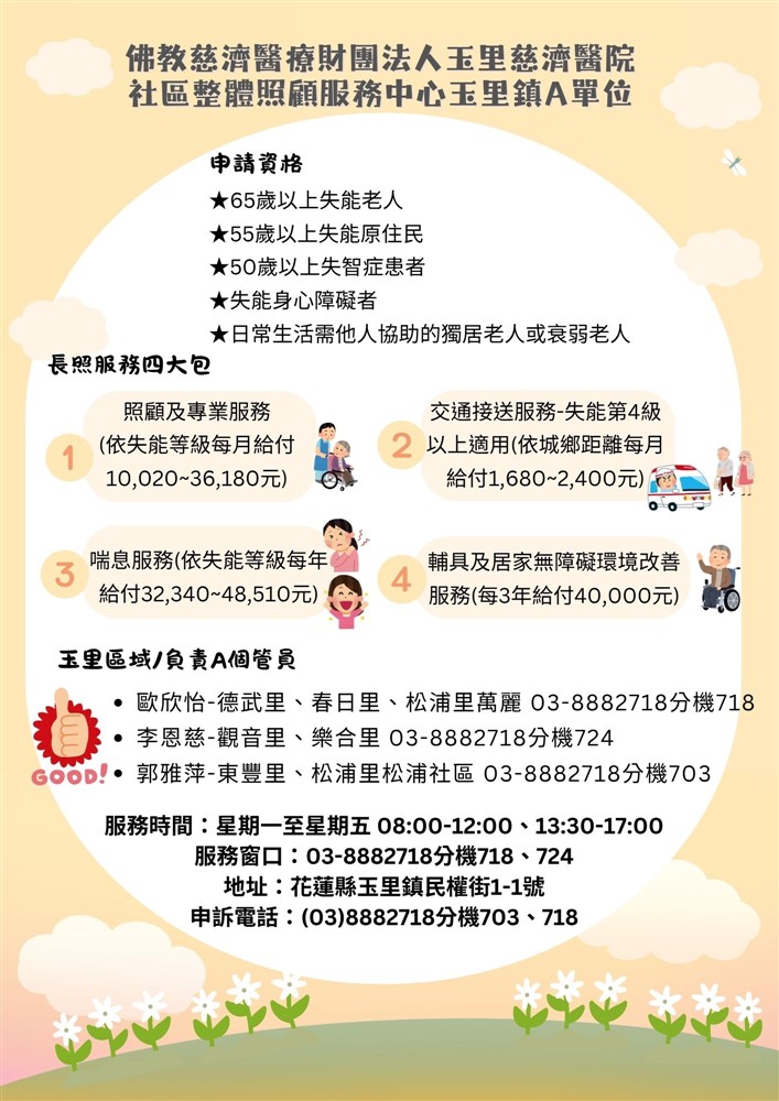 慈濟醫療財團法人在二○一九年先後成立了玉里慈濟居家長照機構及玉里慈濟居家護理所,讓駐守東部偏鄉的玉里慈濟醫院,以有願就有力的精神實踐著長照 2.0,服務花蓮縣南區鄉親。數年來,又見偏鄉長照的需求有增無減,也愈加重視多元化和個別化,在機緣促成下,二○二四年「慈濟醫療財團法人 玉里慈濟醫院社區整合型服務中心 玉里鎮A 單位」成立,玉里慈院A 單位個管團隊秉持著職人專業與小蜜蜂般的行動力,穿梭在一九三縣道,為有需要的案家提供連結照顧與資源的長照服務。
