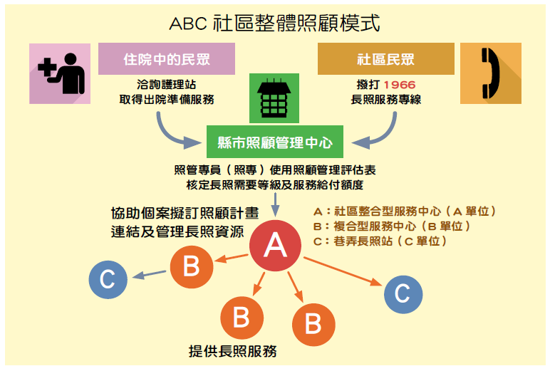 社區整合型服務中心(簡稱A 單位)服務個案的來源,其一是民眾經由撥打「1966」申請長照專線,衛生局接獲後,會先將案件派給各縣市的長期照顧管理中心,由照顧管理專員(簡稱照專)到案家評估失能等級,如若身分符合,就會交給居住地的長照A 單位,由A 個管員到案家評估服務需求,並擬定照顧計畫及連結長照服務。其二是醫院端的出院準備銜接長照服務計畫,由跨專業服務團隊的評估人員針對符合長照服務資格者,於病人出院前三天以照顧管理評估量表執行長照需要等級(CMS) 及照顧問題評估,後續再由長照A 單位個案管理員依據評估等級及給付額度,與個案、家屬或主要照顧者討論擬定照顧計畫,三天時間內送件,經照專審核,協助個案於出院返家七天內取得所需長照服務及資源。其後透過每個月的電訪、每半年一次的家訪,去追蹤和掌握個案的狀況,據以調整服務內容。