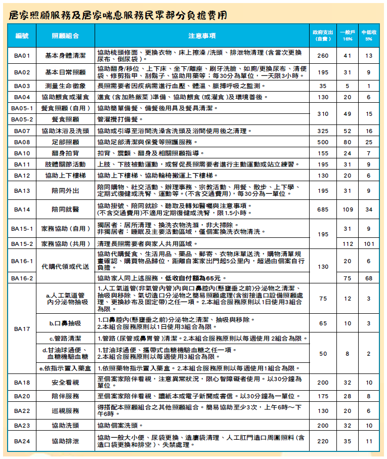 B 單位提供的居家服務項目與公定收費標準。目前玉里慈院A 單位合作的居服機構有二十多家,A 個管經了解案家的需求後進行媒合與派案,由居服員到府服務。圖/玉里慈院提供