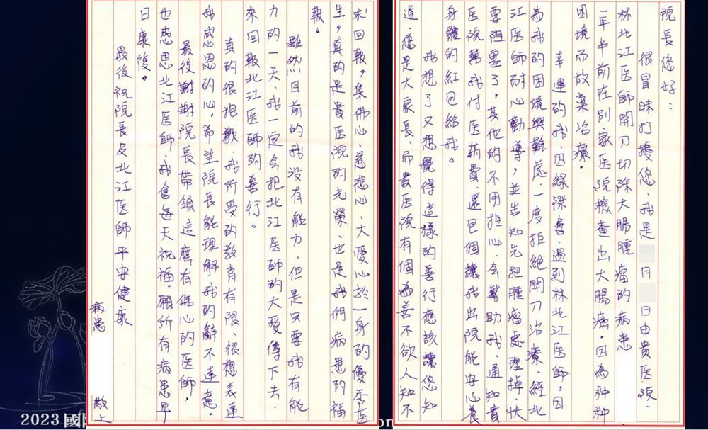 另一封信,來自一位原本不肯接受治療的病人。這位病人一年半前就在其他醫院被診斷出大腸癌,卻遲遲沒有治療,後來更嚴重了,來到台中慈院,大腸直腸外科林北江醫師苦勸他:「已經快要完全阻塞了,一定要治療。」但病人依然不肯,再三盤問,原來是經濟困難。林醫師要病人別擔心,他會請醫院協助醫藥費。