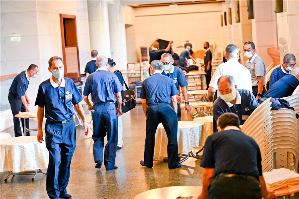 機動組依課務需求搬桌擺椅進行場布。攝影/黃連財