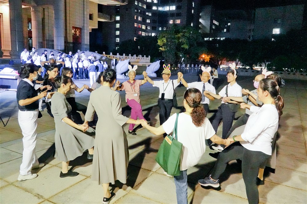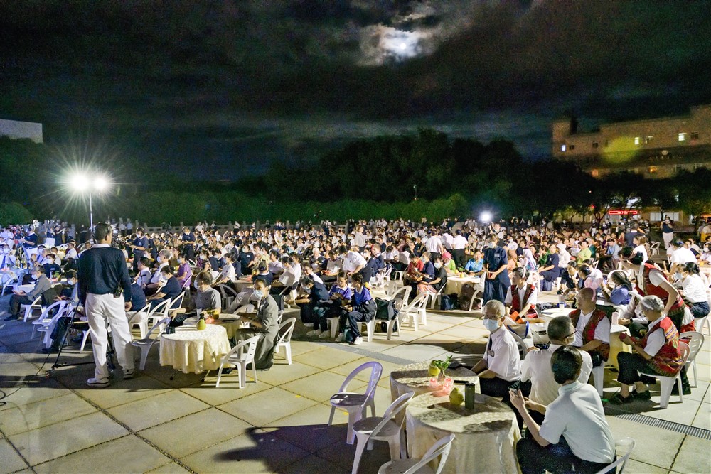 今年是TIMA 人醫年會因疫情相隔三年後的第一次中秋晚會,在豐盛的歐式自助餐之後,學員走出同心圓餐廳,驚喜望見皓月當空,一場心靈饗宴在高雄志工與宗教處課務團隊、各國家地區學員精心準備下,晚間準時七點在道侶廣場上歡喜展開。