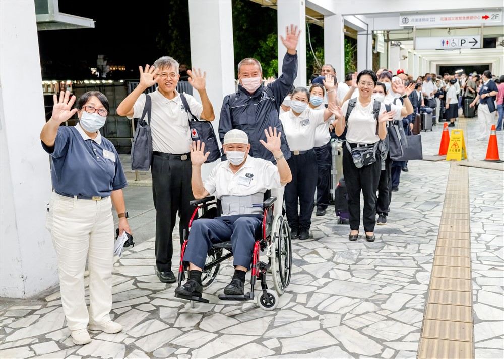 九月二十八日傍晚於花蓮火車站迎接人醫成員。巴西人醫林品全醫師(坐輪椅者),身邊有馬來西亞邱世德醫師(左)與約旦陳秋華師兄(右),從桃園相識結伴同行,戲稱「桃園三結義」。攝影/李則忠