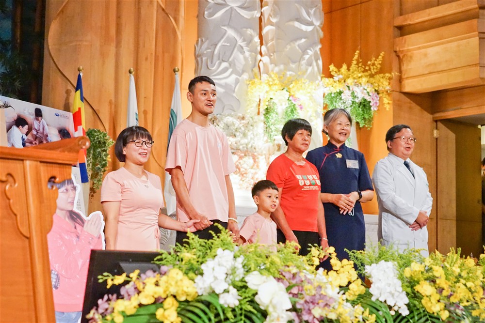來自廈門的雙膝反曲病人陳團治(左一)九年前在花蓮慈院歷經困難手術治療而翻轉人生,此次人醫年會上,她與家人向陳英和醫師(右一)與慈濟志工道感恩。攝影/廖佳婷