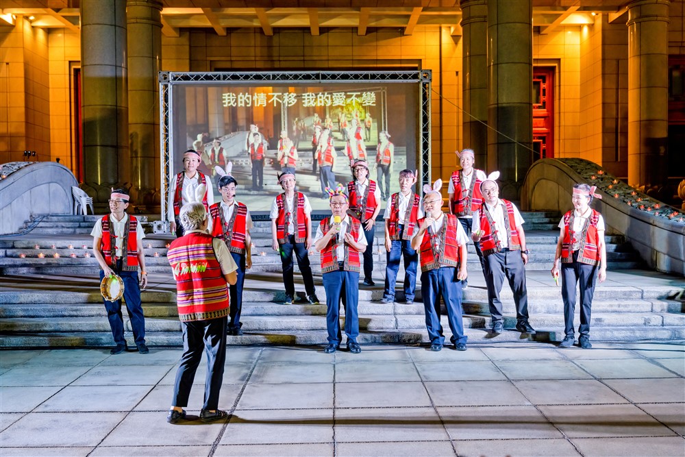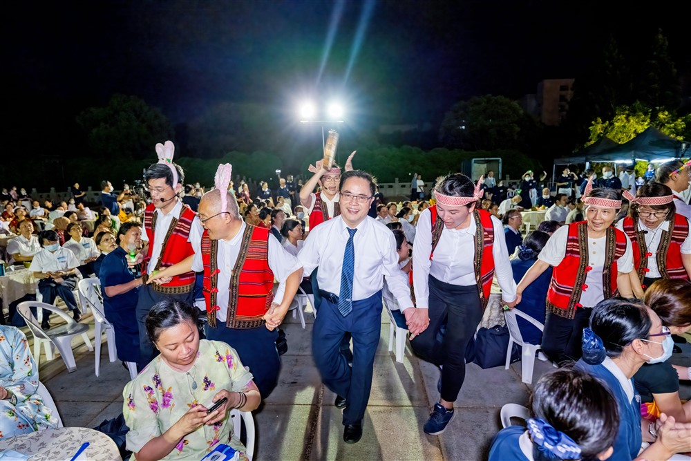 二位主持人以中英文開場,歡迎大家一起搭乘2023TIMA 航班周遊世界。首先由高雄年輕團隊演出醫病溫馨故事小劇場,搭配老歌新唱,藉著說唱詞曲歡迎全球人醫共賞明月。接下來由主辦此次年會的花蓮慈院護理部,攜手慈科大護理系外籍學生,演出原住民舞曲,由鍾惠君主任扮演的阿美族公主,與護理部「真的」原住民督導、阿長,帶動全場加入,貴賓與志業體主管也紛紛加入排舞,手牽手圍成一圈圈,舞動整個廣場,明月當空,為中秋團圓帶來最歡喜的暖場。