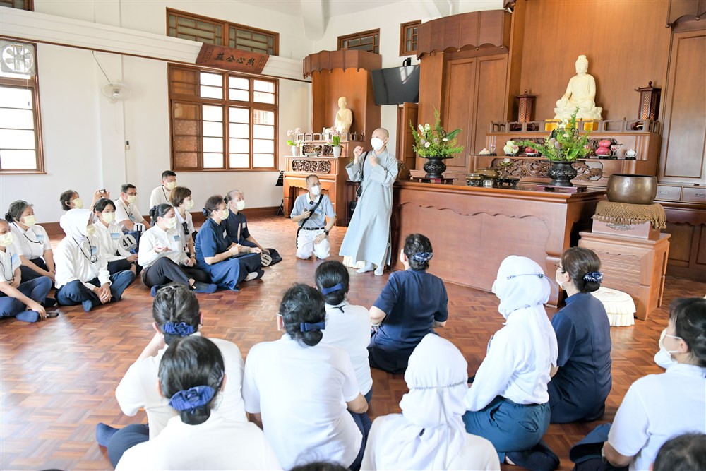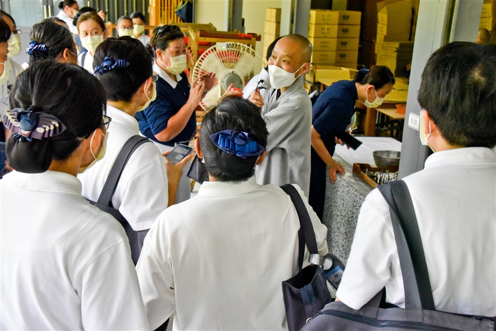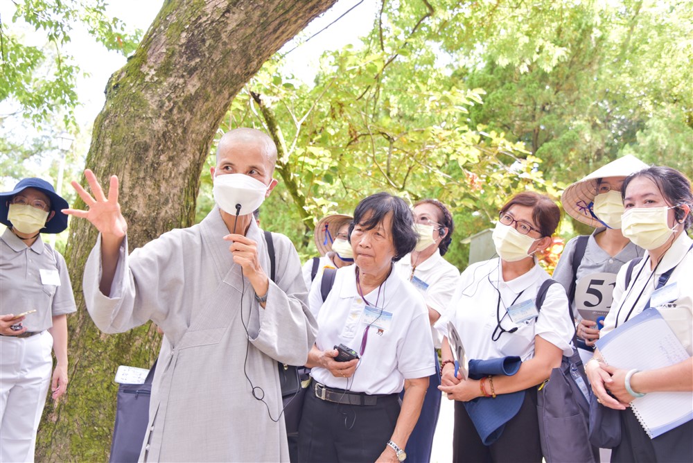 緊接著是眾所期待的精舍巡禮課程,將近四百位人醫會成員,搭接駁車移往靜思精舍,在法師的帶領下,佛堂、朝山步道、陶慈坊、大愛農場、蠟燭間、庵摩羅果園、普明寺,一步一步,走訪精舍的不同角落,細細體會上人創辦慈濟的精神理念。