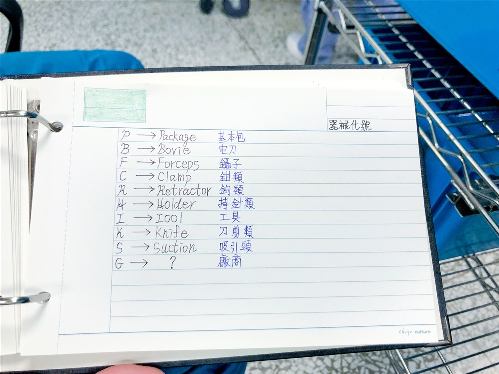 右圖:吳正杰筆記清楚條列器械中英名稱對照和代碼,正是深刻紮實的學習歷程記錄。