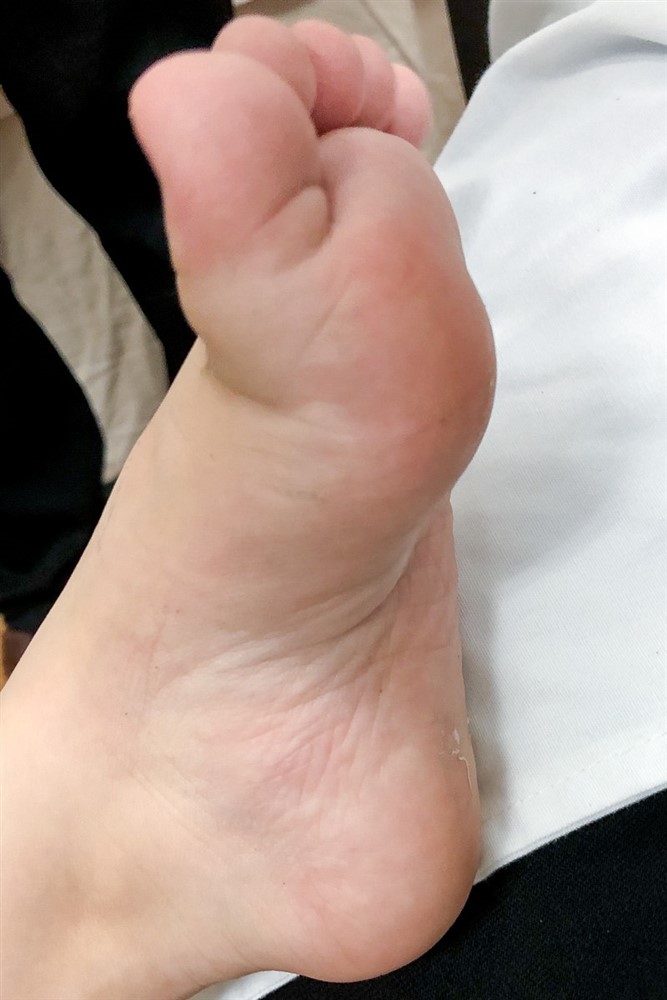 邱佳儀醫師說,軒軒從出生開始腳的肌肉就沒有力氣,會因為肌力不平衡而導致關節變形,再加上感覺功能的缺損,皮膚容易磨損、長繭,因此會讓他穿上特殊鞋墊,防止足部肌肉關節的變形。