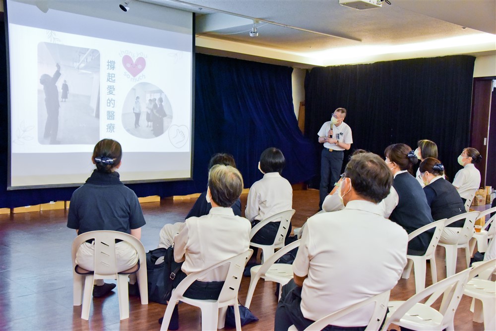 古茲曼醫師先向學員們致歉,因為他的祖母很早過世,來不及教他說中文。接著他先感謝曾經教過他的人,包括花蓮慈院、美國慈濟的中醫師群,以及崇仁醫院的主管及醫師。
