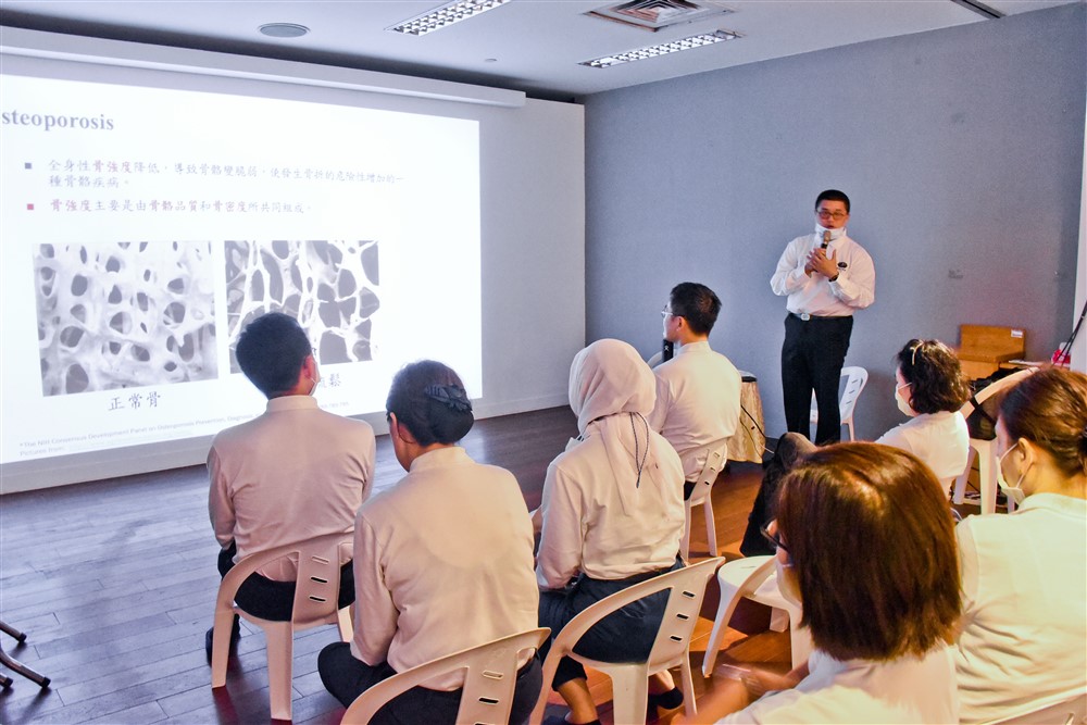 接著由花蓮慈院骨科部副主任葉光庭醫師介紹花蓮慈濟醫院骨質疏鬆照護中心的服務與特色,談骨質疏鬆的成因與治療,特別強調預防骨質疏鬆的方法,包含均衡飲食、適當運動以增加骨密度及降低骨折風險、每日至少攝取鈣質一千毫克、五十歲以上成人建議每日攝取維生素D3 約二十毫克、預防跌倒並適當保護等。「骨質疏鬆的預防,最重要是生活習慣的改變,飲食習慣的注意,平時多運動、肌肉強化,預防勝於治療,而不是仰賴藥物治療。」