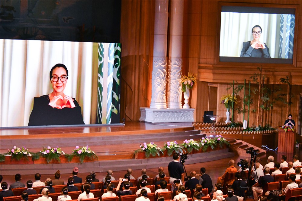 國際巨星也是奧斯卡最佳女主角得主楊紫瓊特別錄製祝賀影片,楊女士曾二度拜訪證嚴上人,二○二一年亦在慈濟榮董實業家陳志遠師兄的邀請下,參與馬來西亞水災後的災區清掃活動。楊女士感恩全球慈濟人醫會成員在世界各地幫助無數病人,結合醫療照護與慈悲關愛,改變了無數人的生命。身兼聯合國開發計畫署親善大使與國際奧運委員會成員的楊女士,呼籲大家多關心全球議題,團結起來從事有意義的行動。她誠摯感恩上人帶領慈濟志工以群體的實際行動改變了世界,並期待再次到靜思精舍拜訪。