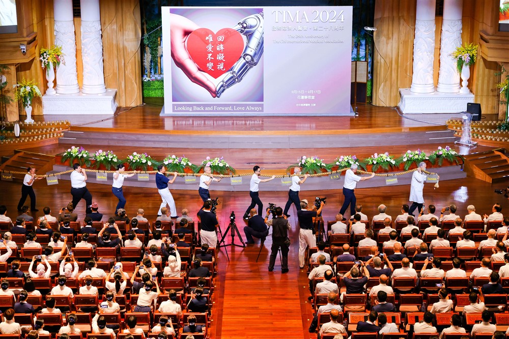 慈濟人醫重任,有堅實的基礎,也要有新生代的傳承,從各地人醫會創立的時間順序開始,慈濟醫療法人也是人醫會的召集人林俊龍執行長扛起臺灣人醫會的大索,緊接著菲律賓、美國、新加坡、馬來西亞、印尼、澳洲、約旦、越南、尼泊爾、香港、日本、柬埔寨人醫代表依序接力扛起大索,到定點則由年輕世代接力,象徵人醫精神代代傳承的堅定與希望。司儀接著一一介紹這次到場的各國家地區學員,在掌聲中大家起立揮手相見歡,而學員代表們在舞臺上接下由四大志業主管致贈各國家地區各一幅「人醫問病圖」的水墨畫。