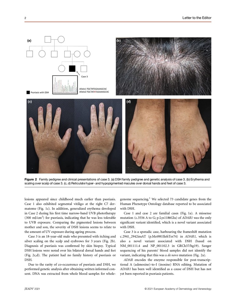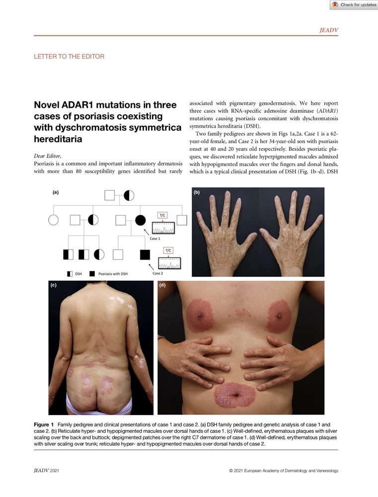 張中興主任在門診發現有位三十四歲乾癬病人的手指、手背上有網狀色素斑沉澱,是典型的「遺傳性對稱性色素異常症(DSH)」,經由問診得知病人的母親也合併有乾癬與DSH;後來又診斷第三位同時患有乾癬及DSH 的病人。張中興主任表示,當下即假設人體內的「ADAR1 基因」參與RNA( 核糖核酸) 的編輯,該基因的突變可能參與了乾癬免疫訊息路徑異常的致病機轉。於是和國家衛生研究院蔡世峰教授合作,針對這三位病人進行ADAR1 基因的檢測及研究,發現了新的基因突變點,首度證實單一ADAR1 基因突變足以導致乾癬的發生。