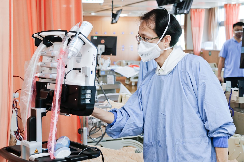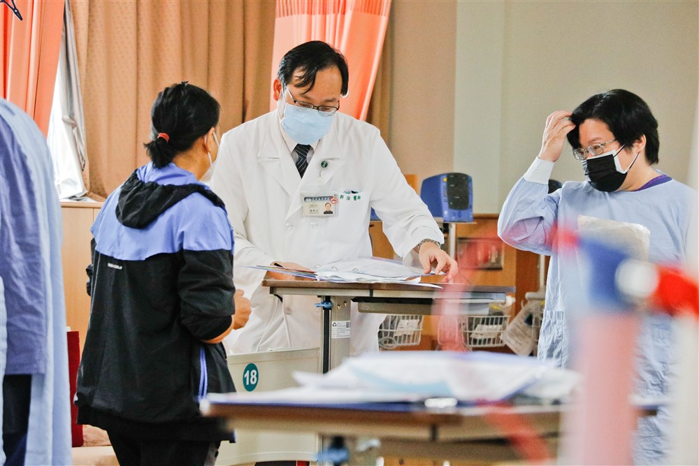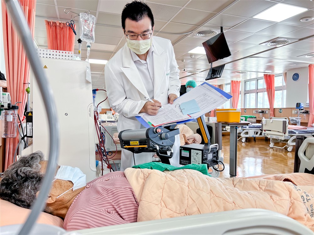 花蓮慈濟醫院腎臟科郭秋煌醫師是試營運第一天的負責醫師,叮嚀腎友在透析室裡安心放心。