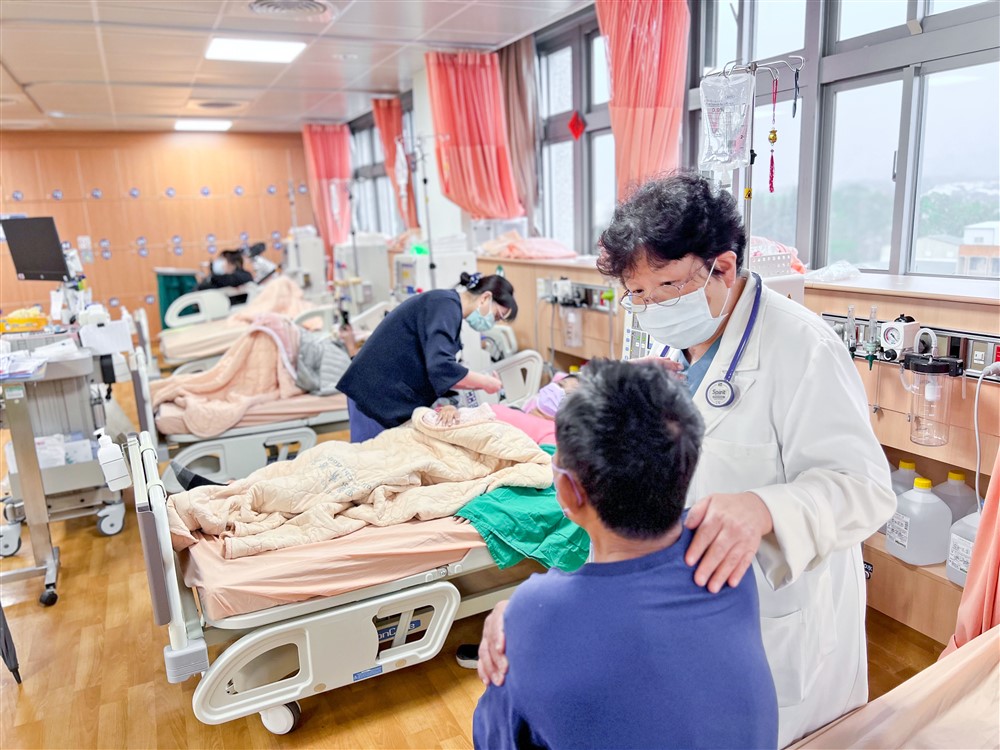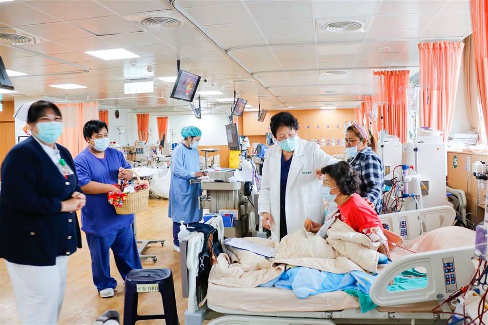 「腎臟科門診其實就是在照顧腎臟慢慢受傷即將進入洗腎階段的病人。」花蓮慈濟醫院腎臟科郭秋煌醫師說:「只要是花蓮南區的病人,我們都會很忐忑,因為要開始一一盤點哪裡的洗腎室有空位,只要從鳳林往南都很難找,於是像過年或疫情緊急、季節轉換都會找不到,病人呼喊南花蓮需要洗腎室其實已經很多年了,只是成立的速度趕不上我們老一代對腎臟沒有那麼照顧的趨勢。我們試營運到今天一個月,第一天剛好也是我,記得那天我們的腎友金先生有點不太適應,可能還沒有準備好要當一個洗腎病人,但確實當一個洗腎病人不是那麼容易,在透析室裡面要躺四個小時,心裡煩的事情非常多,要怎麼樣把心靜下來,好好看大愛臺的上人開示,需要護理同仁耐心地安撫。」
