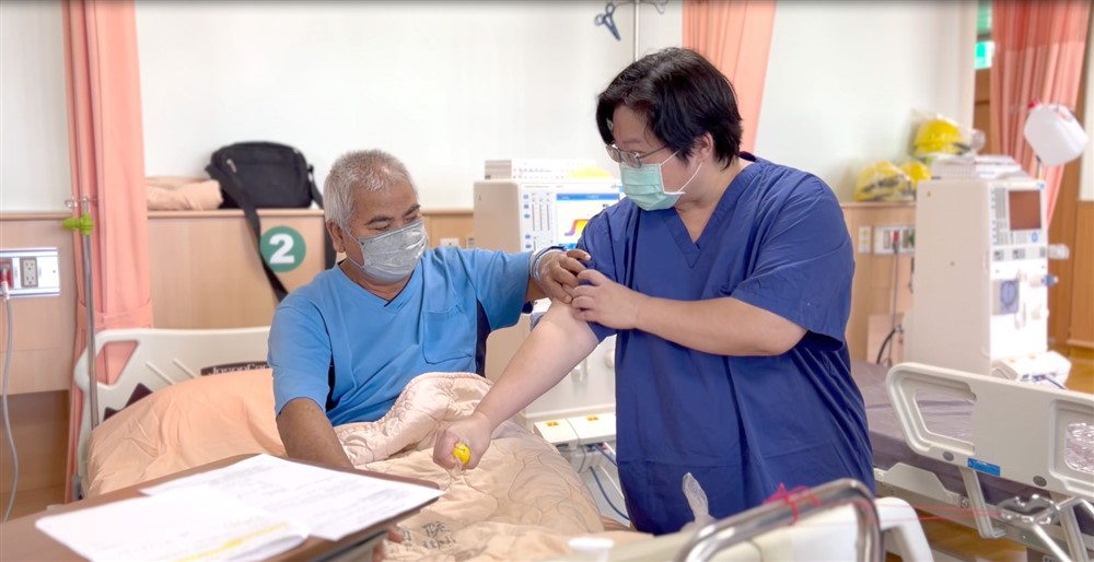 玉里慈濟醫院血液透析室的第一位病人金大哥,在第一次洗腎時,花蓮慈院血液透析中心林欣穎組長教導彈力球手臂運動活化血管彈性。
