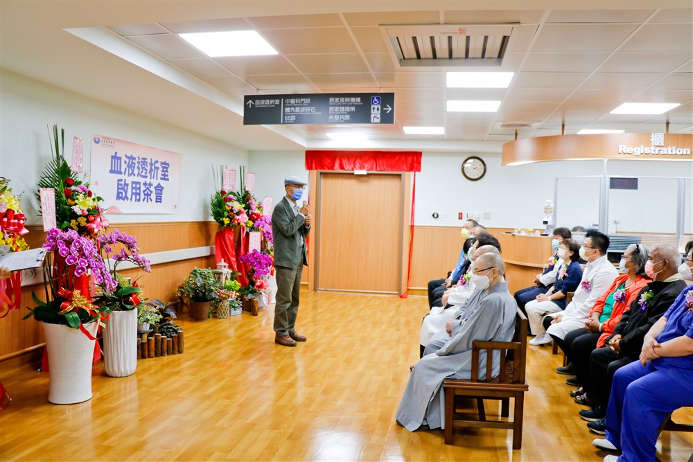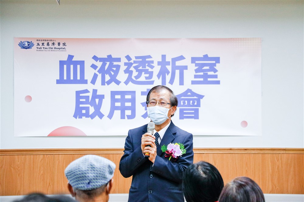 花蓮慈濟醫院吳彬安副院長說:「雖然今天下著大雨,但還是有這麼多貴賓與精舍師父與會指導,一切都是好的開始。玉里慈院的血液透析室終於開幕了,雖然本來預計是七月一日要開始,但受到疫情的影響,再來又遇到九一八大地震,所以就一直延期到今天⋯⋯兩年半前在關山已經開設血液透析室,要把這麼漂亮的血液透析室建立起來,真的需要非常多的人力,首先要感恩衛生局指導協助,陳岩碧院長也很盡心盡力地在執行,醫院空間不夠將行政部門搬遷到員工宿舍,讓工程進駐六樓施作約十個月。」吳副院長也回顧上人建置玉里慈院即是本著尊重生命的愛心,「花蓮慈院團隊亦步亦趨協助血液透析室穩定並且茁壯,將來再慢慢設置急重症的科別,在這裡搶救更多的病人。」