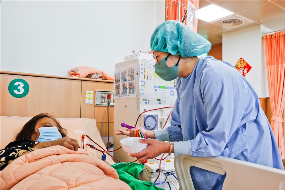 護理師在腎友透析的同時進行衛教,希望腎友每天飲食正確而均衡,才能護腎,甚至逆轉腎功能。
