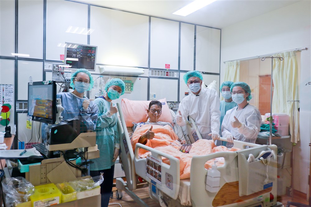 術後第三天郭先生已經能半坐臥,跟醫療團隊比讚留影。攝影/卓冠伶
