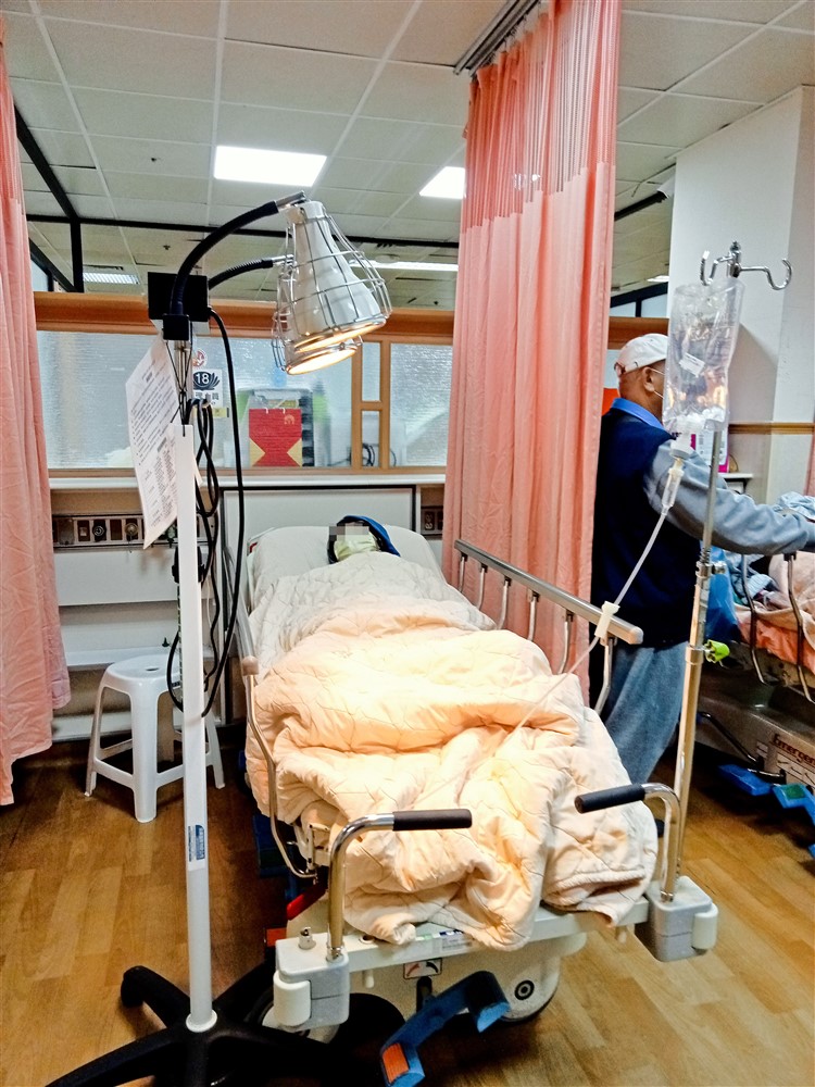 周太太焦急的在門外等了約莫半個小時,小周被推出急救區,安排在急診室接受治療,小周右手食指接著「血氧偵測儀」,左手手臂打上針管接著點滴,藥物順著點滴進入體內,床頭上方架著一臺監測生理數值的螢幕,護理師定時過來看一下數值。由於小周一直喊冷,尤其是下半身,急診護理師貼心地幫他架起了烤燈。急診賴佩芳醫師先開藥處理他發燒的症狀,同時一邊開立相關檢查,希望盡快找出發燒的原因。