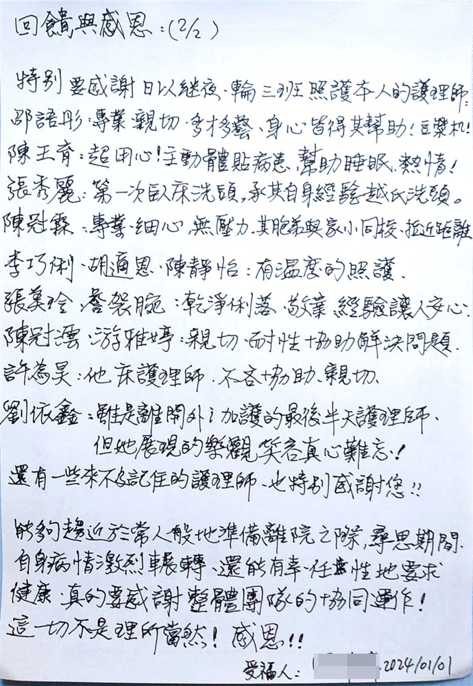 在二○二四年元旦這一天,周先生寫下對醫療團隊的感謝。