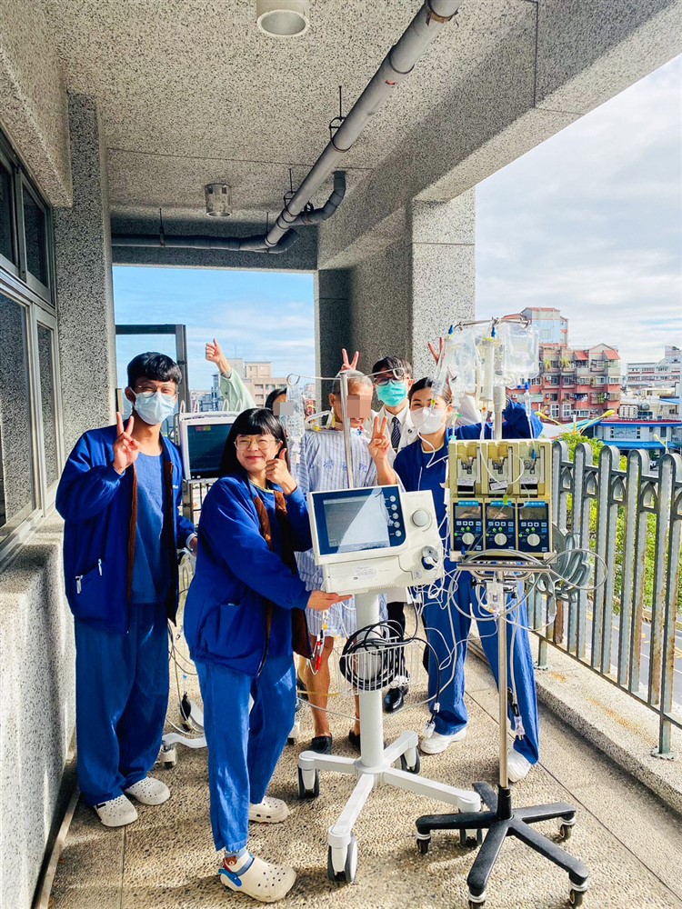 觀察心臟功能有恢復跡象,張睿智主任決定讓周先生下床走路,十二月十一日上午八點,成功地進行了張睿智主任口中的「王爺出巡」!圖/外科加護病房提供