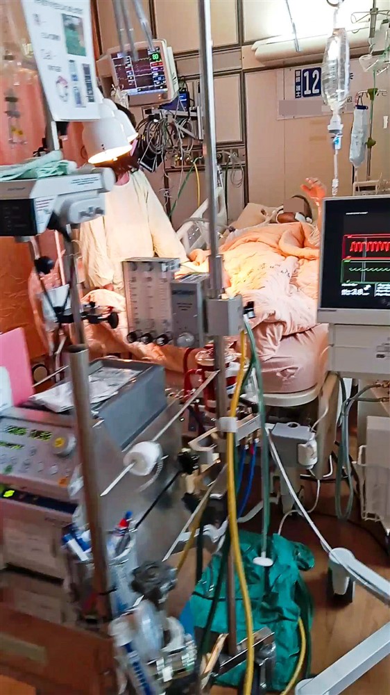 當天晚上七點十分,從西部大學趕回來的孩子們在護理師的陪同下進入內科加護病房,看到床上躺著頭部上抬、嘴裡塞上呼吸器、四肢被架開、全身因麻醉一動也不動的爸爸,兩行眼淚直接唰地流下⋯⋯走出加護病房的自動門,周太太與二個孩子帶著沉重的心情回到家,討論後也決定萬一需要的話,讓爸爸裝上自費的微型人工心臟。