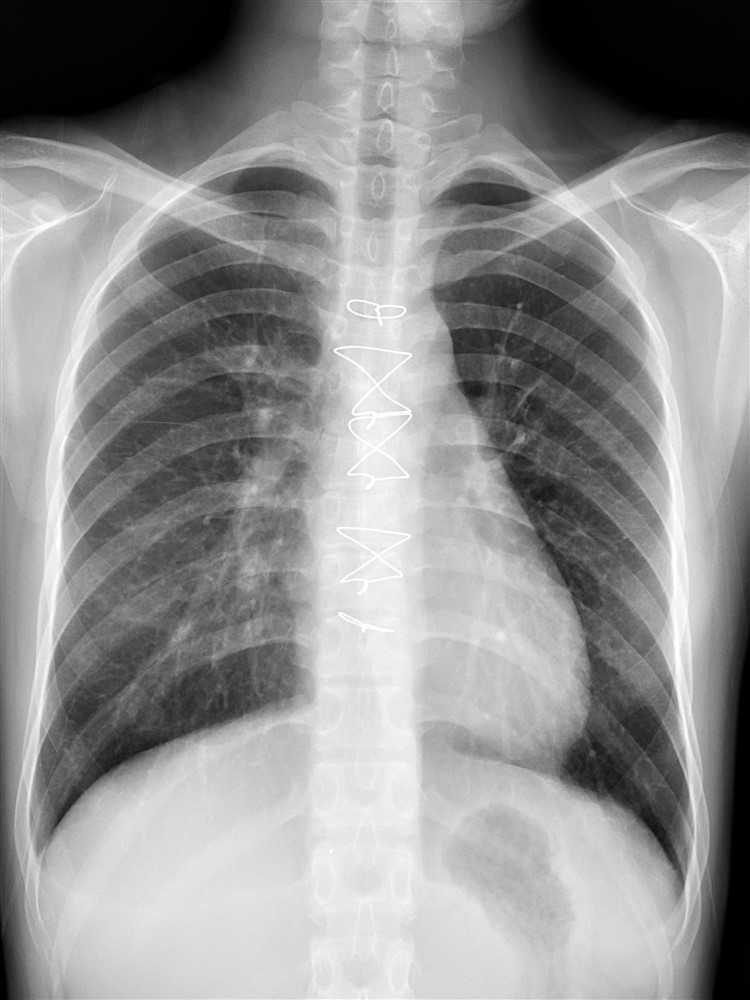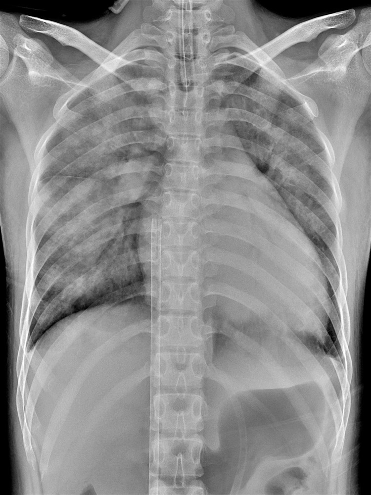 鄭小姐裝上葉克膜六小時,胸腔X 光影像中肺部幾乎呈白色,肺水腫嚴重且心臟明顯擴大。