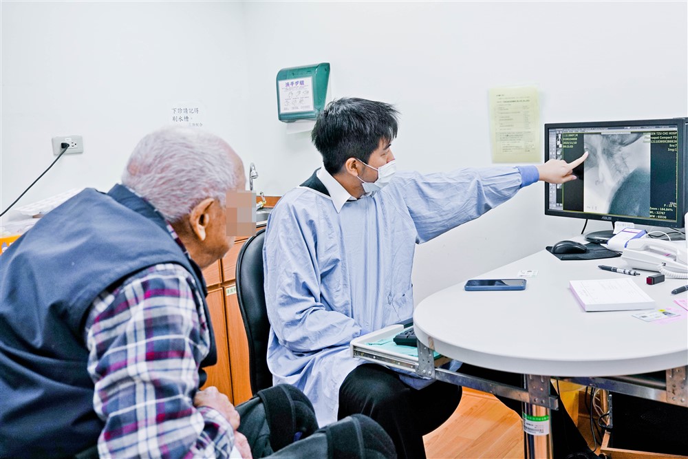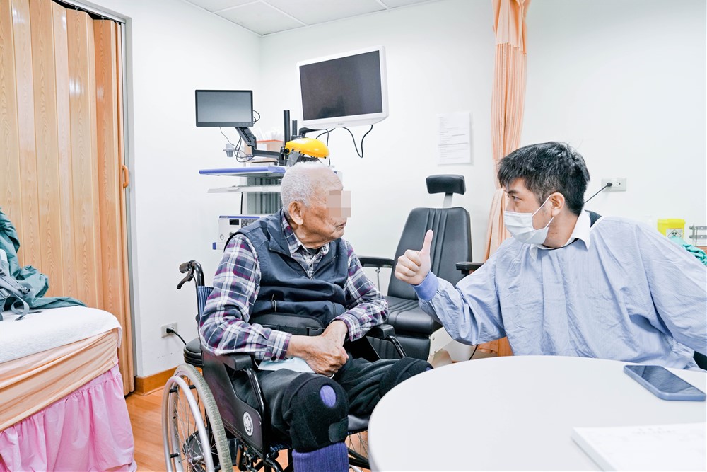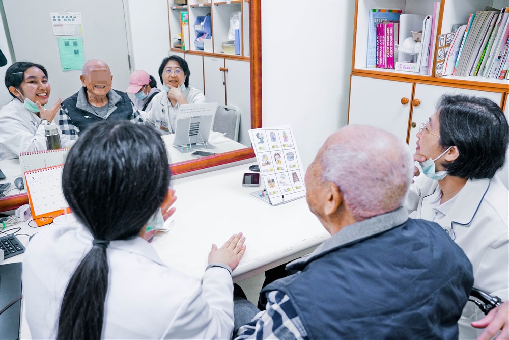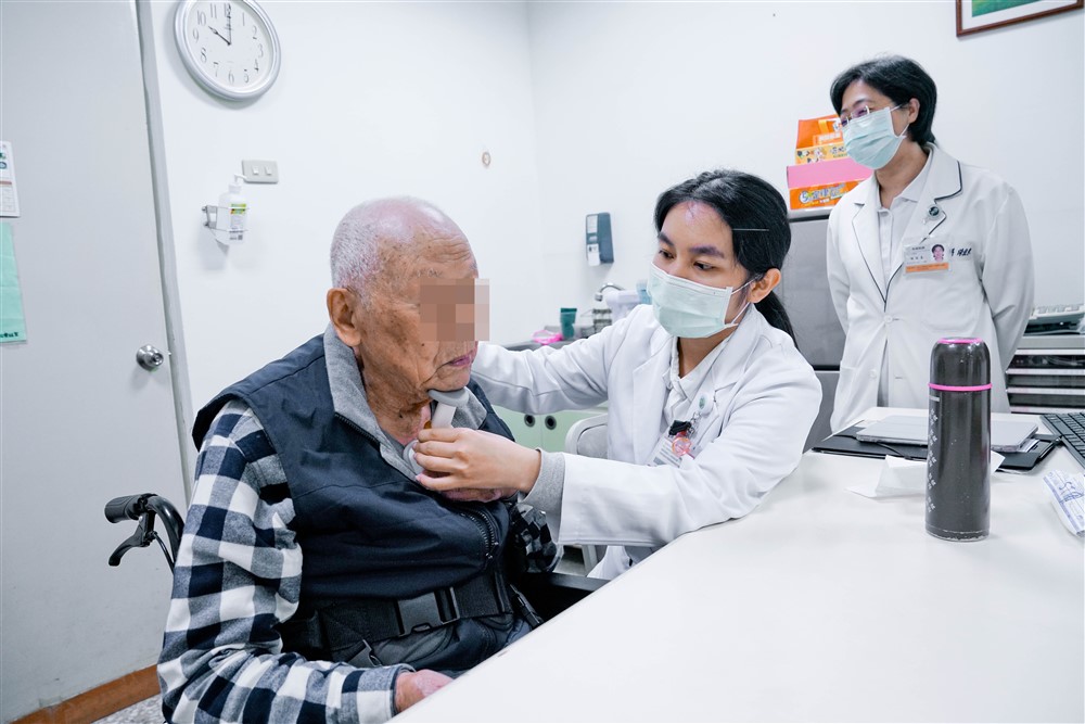 花蓮慈濟醫院復健科門診,葉映廷醫師為長者檢查並說明,給長者信心鼓勵,吞嚥障礙可以改善。