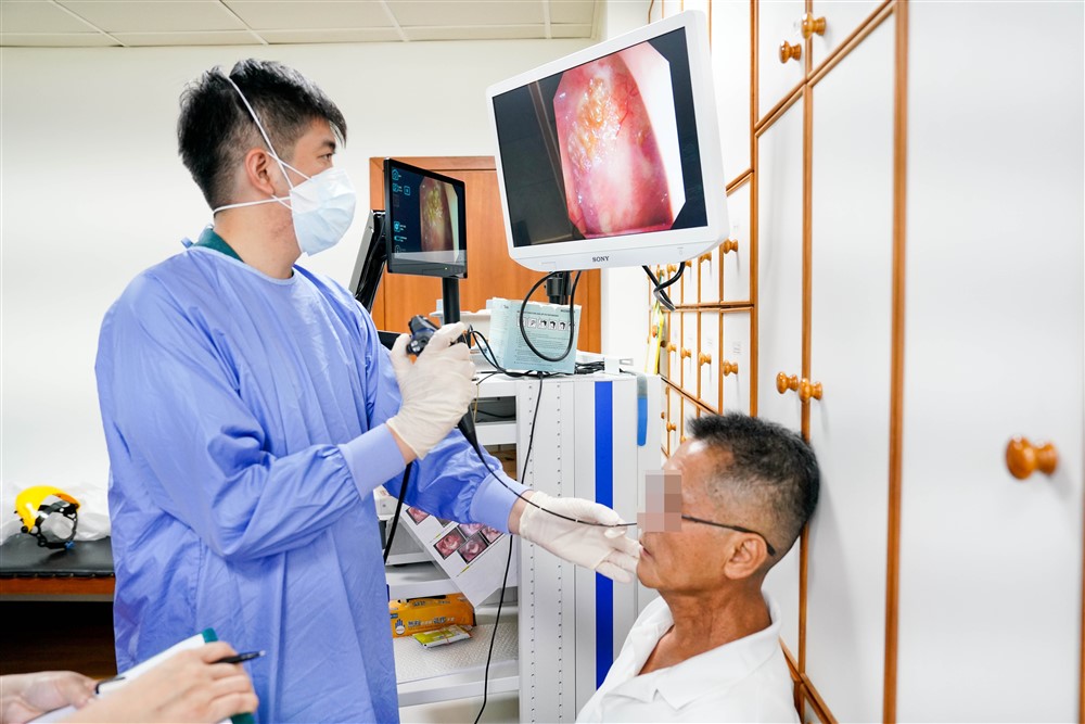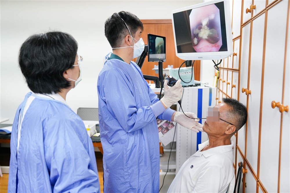 以六十一歲的蔡先生為例,他在十三年前罹患鼻咽癌,經過放射線治療與化療後症狀緩解,因發現有喉嚨無力,喝水容易嗆到等吞嚥上的困擾,講話時舌頭靈活度也大不如前,於是到吞嚥障礙特別門診。葉映廷說,經以纖維內視鏡吞嚥檢查後,發現他還沒咀嚼咽部就有口水堆積,而且會咽軟骨敏感度不佳,容易嗆咳;檢查過程也指導他調整姿勢,例如請他將頭後仰,水吞得比較乾淨,也建議他應避免吃濃稠的食物。