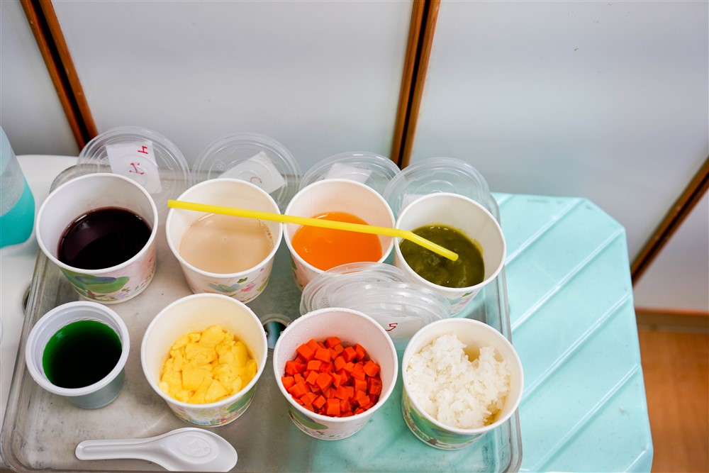 為了精準檢查與治療,營養科團隊根據國際吞嚥障礙飲食標準,調製出質地由軟至硬零到七級的「吞嚥標準化檢查餐」,例如白開水就是零級食物,七級就是質地像白飯的固體食物,蒸熟的胡蘿蔔丁是六級、炒蛋是五級、果凍是四級⋯⋯,葉映廷說,透過不同質地、顏色食物輔助影像檢查,可找出各種病人在吞嚥過程食物殘留或掉到氣管的原因而加以改善。另外使用真正食物的檢查餐,可以更貼切病人生活中的餐點,可以在檢查後協助家屬更了解如何備餐。