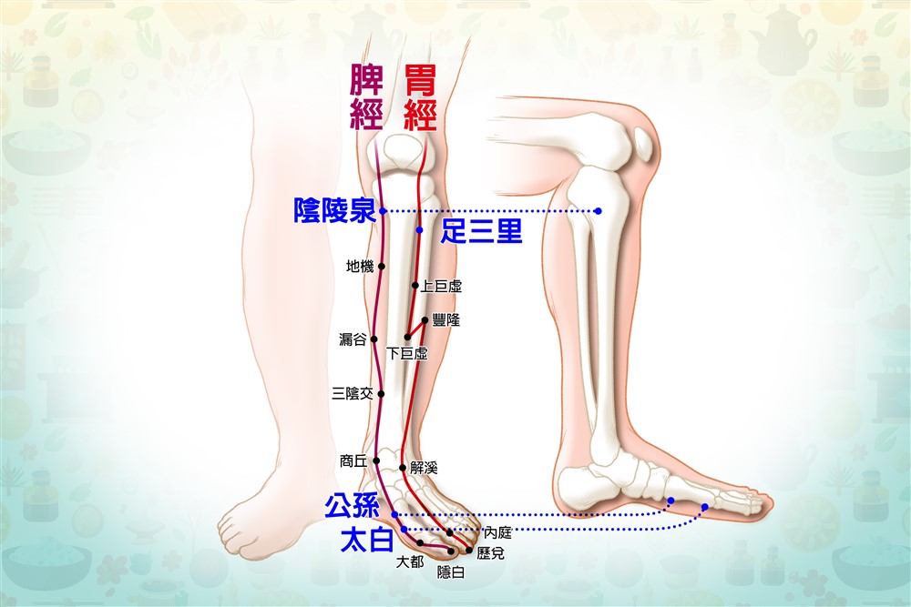 調理方式主要以「健脾利濕」,「補益氣血」為主,讓身體的水分代謝更好,把濕氣排出體外。我們巡迴門診也經常使用雷射針灸打在病人脾經的陰陵泉、太白、公孫等穴位,以及胃經的足三里等穴位,來促進這兩個經絡的氣血循環。