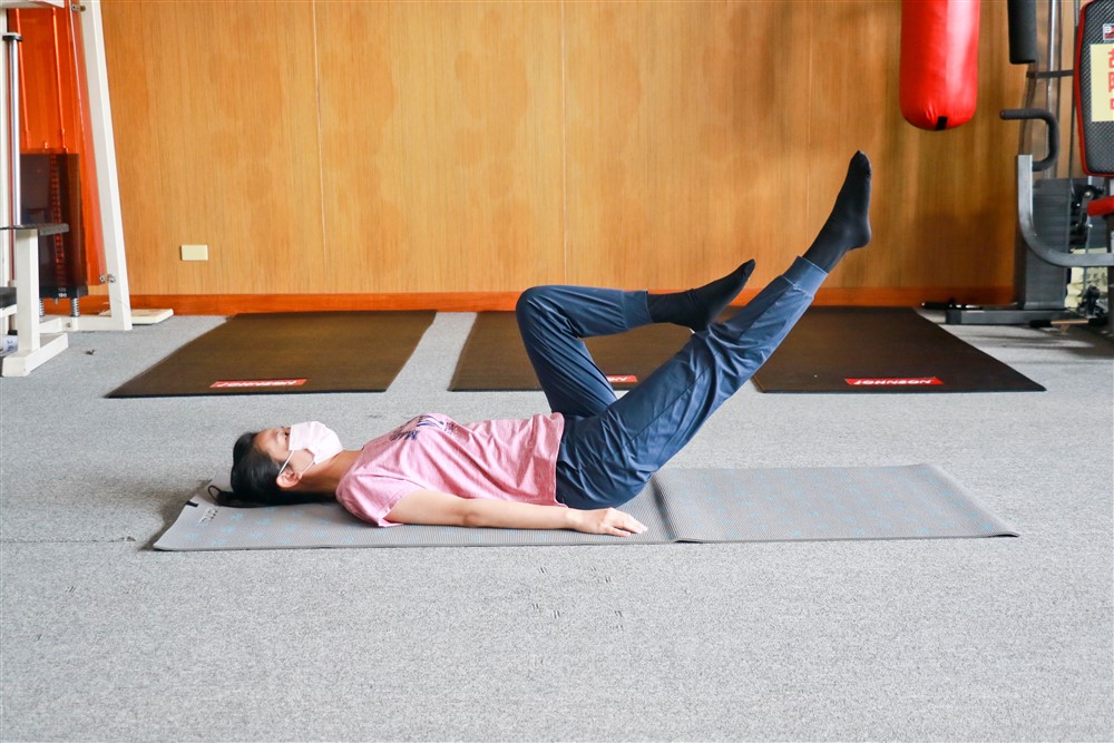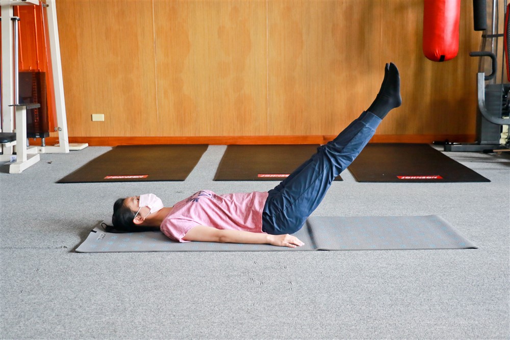 2.雙腿上舉 45 度,腰平貼在瑜伽墊上。