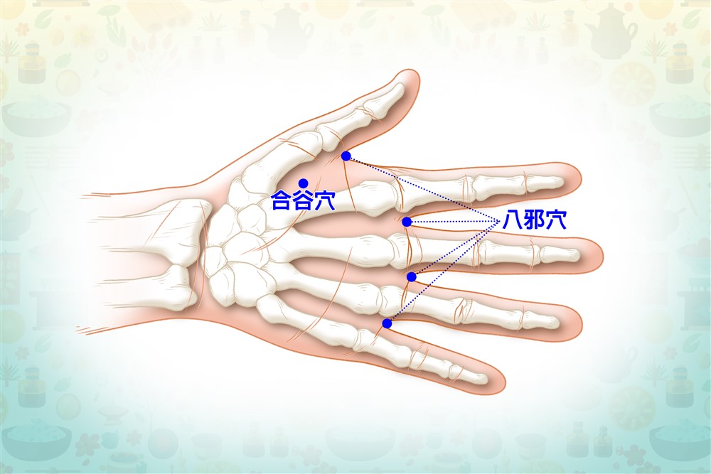過度使用手掌的人,手指裡面的掌側滑間肌、蚓狀肌等肌肉都會出現沾黏現象,可透過按摩兩手虎口的合谷穴與兩手手背第一到五指間,指蹼緣後方赤白肉際處的八邪穴,鬆動掌間肌與蚓狀肌等手部肌肉,讓靜脈回流順暢,減緩手部疲勞與痠痛。