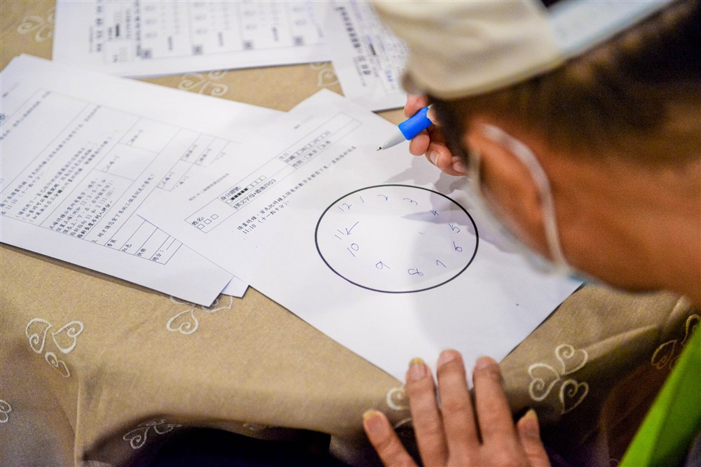李嘉富醫師在社區帶長者做活動,以畫鬧鐘的方式評估定向感。攝影/盧義泓