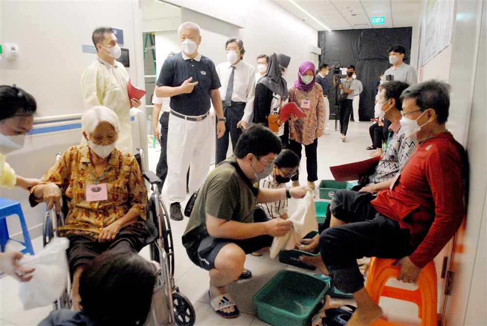 在印尼慈濟團隊的努力下,印尼慈濟醫院於二○二一年如願啟業,因新冠疫情延後至二○二三年六月正式營運,圖為二○二三年五月啟業前義診,郭再源師兄(後排左二)與印尼慈院謝源生院長(後排左三)在現場走動關懷。圖/印尼分會提供