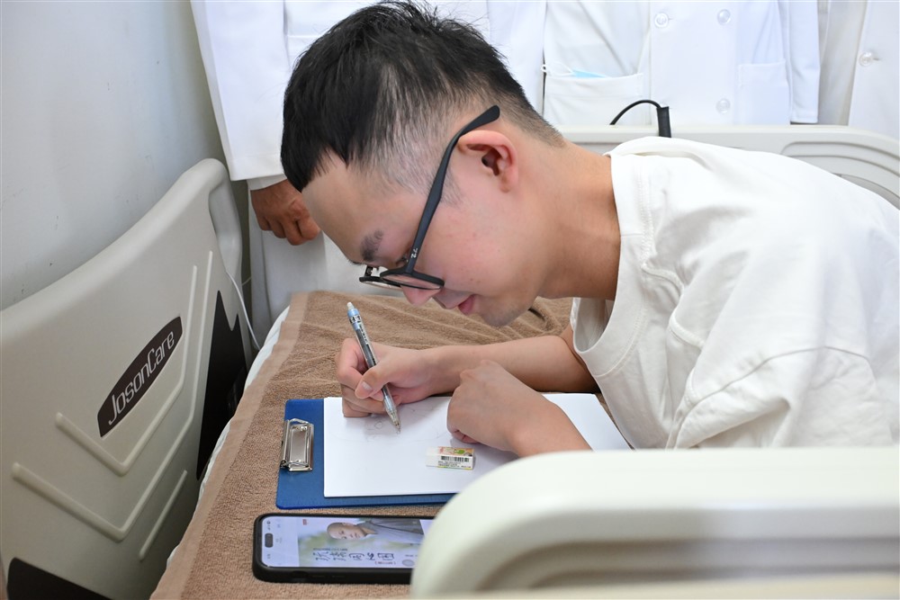 因為中秋節過後,醫療團隊邀請他和媽媽到靜思精舍見證嚴上人,興奮的他決定素描上人的畫像作禮物,也證明他在中西醫團隊精準治療的成果。而這期間剛好在花蓮靜思堂舉辦二○二四年國際慈濟人醫會年會的營隊活動,受邀來的媒體記者聽到他的故事,想進行採訪。九月十六日下午,記者看到他的現況也很驚奇,坐在病床上侃侃而談,陽光開朗的形象,很難讓人想像他罹患罕見疾病「腎上腺腦白質失養症」,而他在幾個月前還曾想放棄治療,讓憂心的媽媽以淚洗面。