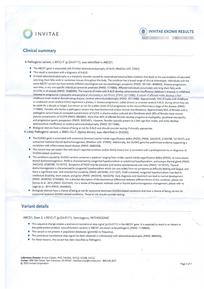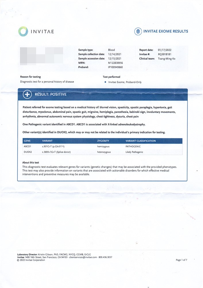 基因檢測「全外顯子檢驗」結果顯示ABCD1 基因突變。