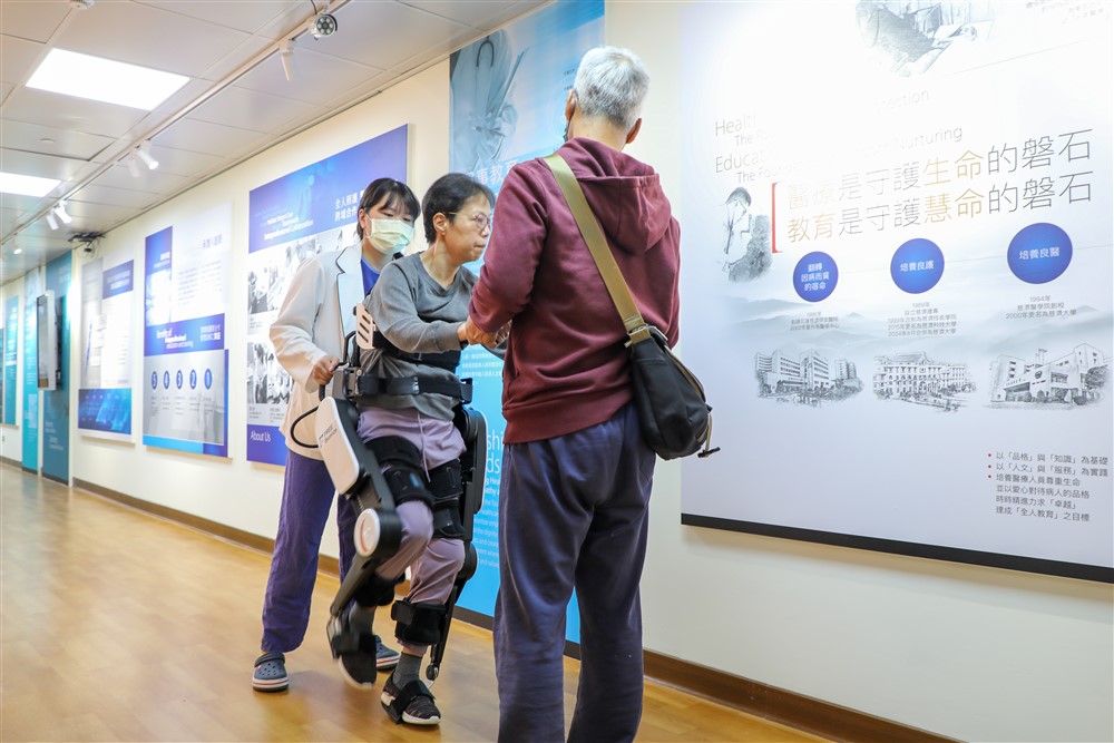 江女士症狀獲改善之後,在先生陪伴及物理治療師指導下,積極復健。圖為穿戴外骨骼機器人撐起上半身,練習行走。攝影/劉明繐