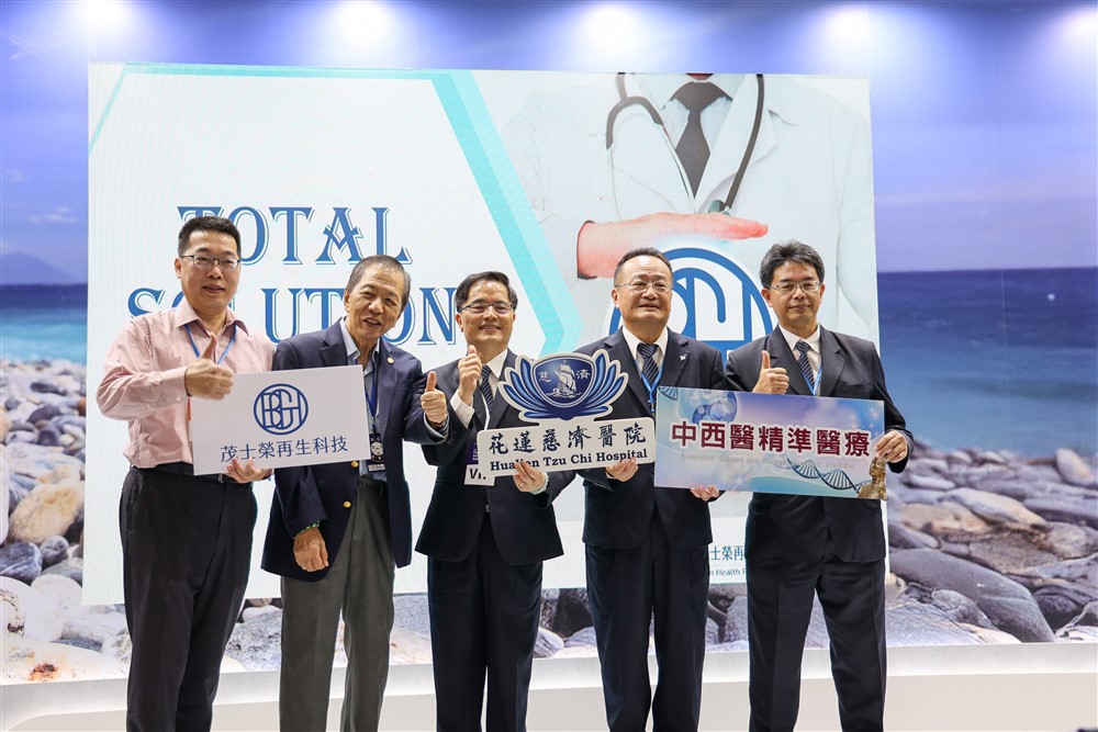 多年來不斷與巴金森病抗爭的蔣行先生(左二),經過花蓮慈院中西醫合療團隊的合作與努力,身體有明顯的進步與穩定可控,進一步與花蓮慈院研究團隊合作;於二○二四年臺灣醫療科技展會場,與林欣榮院長(中)、黃志揚副院長(右二)、何宗融副院長(右一)、茂士榮再生科技總經理林世吉(左一)發表,期盼透過整合再生療法、精準中草藥、針灸與功能醫學的全面治療與修復,幫助受神經系統退化性疾病所苦的人重拾健康。攝影/陳安俞