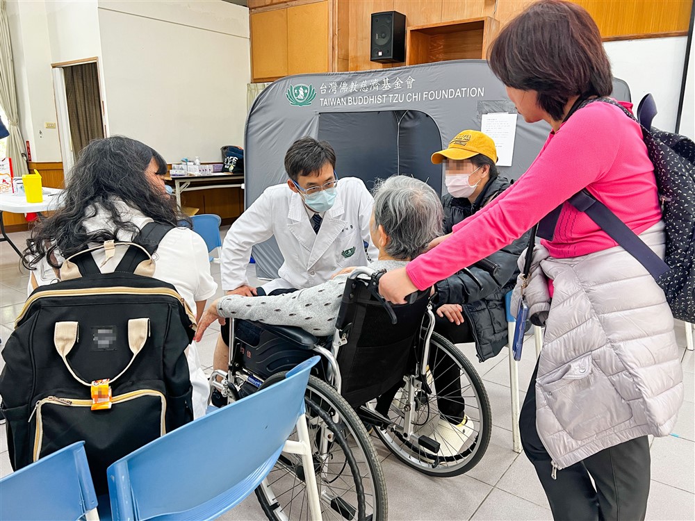 大林慈院義診團隊除了幫志工們看診,當地鄉親聽聞活動中心有義診活動,吳女士及姊姊推著坐在輪椅上的媽媽也來看診。也是受災戶的她們,地震當下住家三樓的窗戶玻璃都被震碎。為了讓病中的媽媽緩解身體不適,特別來到義診現場,診療過程中,鄭竹晏醫師親切和阿嬤話家常,聊著聊著阿嬤精神全來了,忘卻病痛愁容不再,吳女士感恩的說:「慈濟的醫師真的不一樣!」
