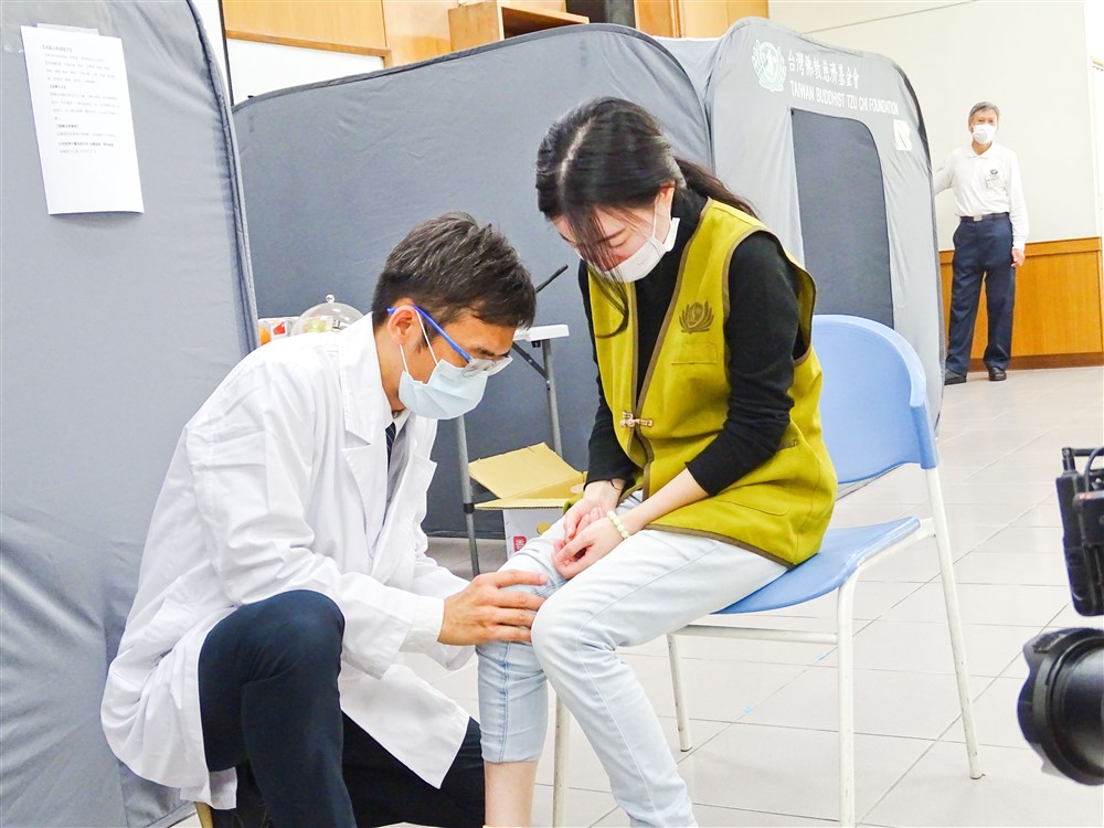 為了守護志工們的健康,十五日的義診當天,在問診前需先量測體溫,如有異常,門口還設置流感篩檢區,由楊雅倫護理長立即檢測。而慈濟人醫會藥師林進財與周玲娟也熱血相挺,依照醫囑配好藥物,一條龍的服務為志工們及時解病痛。