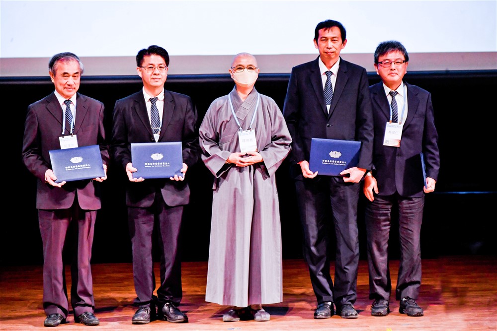 德寋師父頒發個人最佳研究成果獎,左起花蓮慈院泌尿部郭漢崇醫師、台北慈院腎臟內科盧國城醫師、大林慈院腎臟內科蔡任弼醫師,台中慈院心臟內科林茂仁醫師。攝影/廖文聰