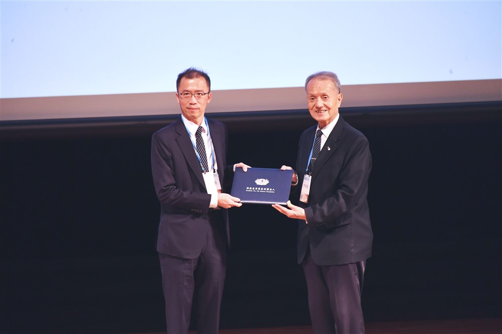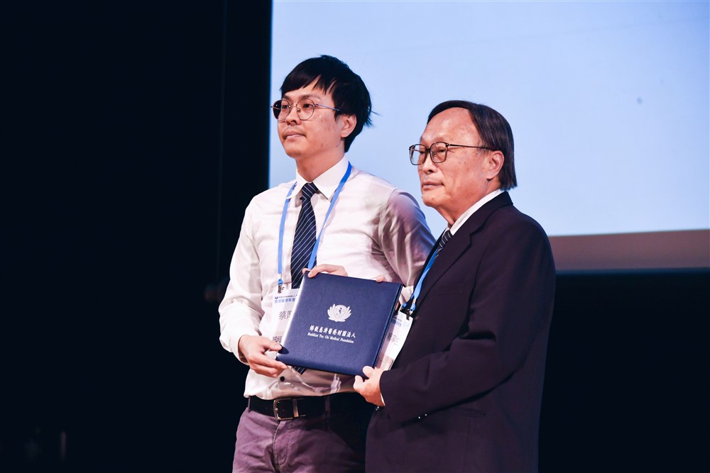 林俊龍執行長頒發醫療志業年度最佳研究成果獎,與獲獎者花蓮慈院腸胃內科雷尉毅醫師(左)合影。攝影/廖文聰