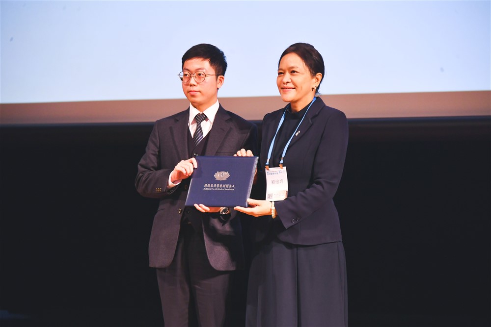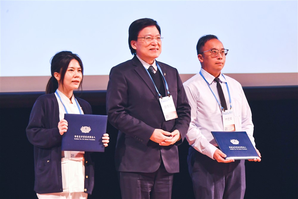 台北慈院趙有誠院長頒發醫事及行政人員最佳研究成果獎。獲獎者花蓮慈院護理部游婉茹專科護理師(左)、台中慈院胸腔內科林煜傑呼吸治療師(右)。攝影/廖文聰