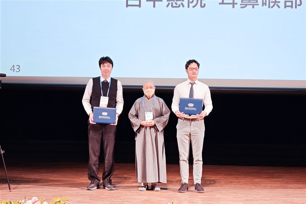 德淵師父頒發個人最佳研究成果獎,得獎者花蓮慈院家庭醫學部黃暉凱醫師(左)、台中慈院耳鼻喉部謝承祐醫師(右)。攝影/謝自富