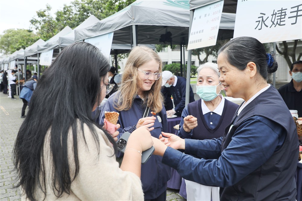 「這個是監獄麵包,還有這個蹲很久才生的鐵窗牌雞蛋。」更生人楊大哥臉上帶著靦腆的微笑,用心介紹產品。陪伴志工潘慧珠解釋,國富和氣慈濟志工所設的「花現幸福」攤位是由重返社會的更生人及仍在矯正機構的同學們共同提供手作麵包、自養雞蛋等產品,希望他們誠懇的付出也能為社會帶來一分貢獻。