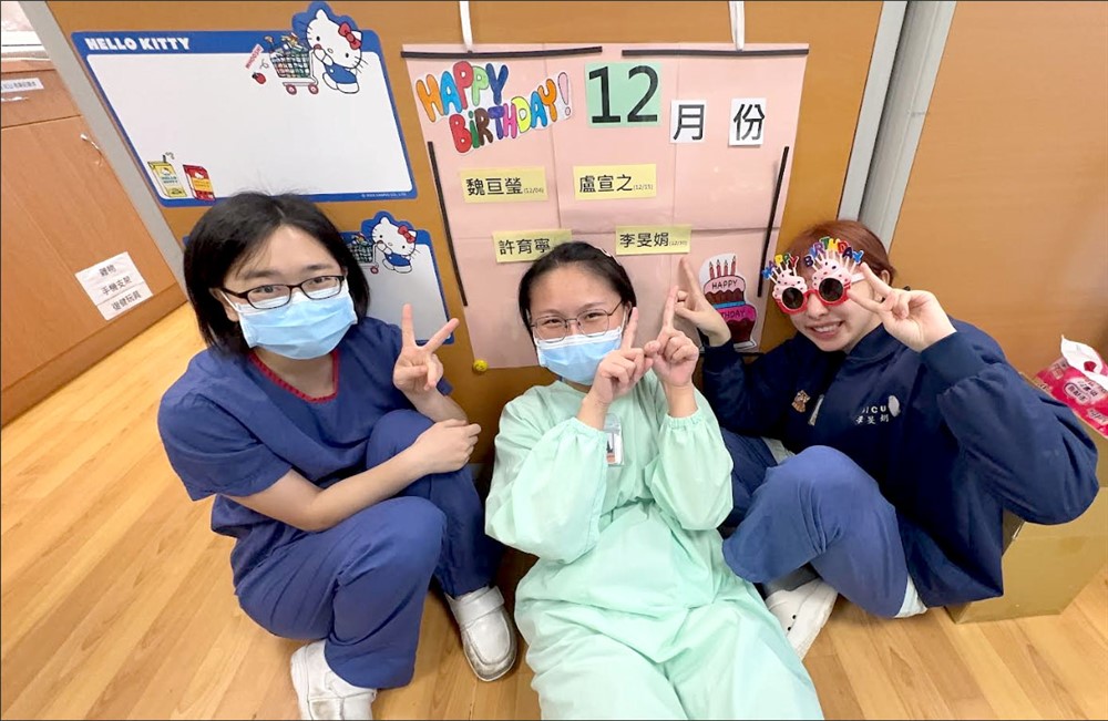 各單位努力提升職場幸福感,如心蓮病房有治療犬帶來溫暖陪伴(上)、身心科病房透過正念卡學習覺察(中)、內科加護病房則設置壽星牆,接收單位同仁的祝福(下)。圖片提供/台北慈濟醫院