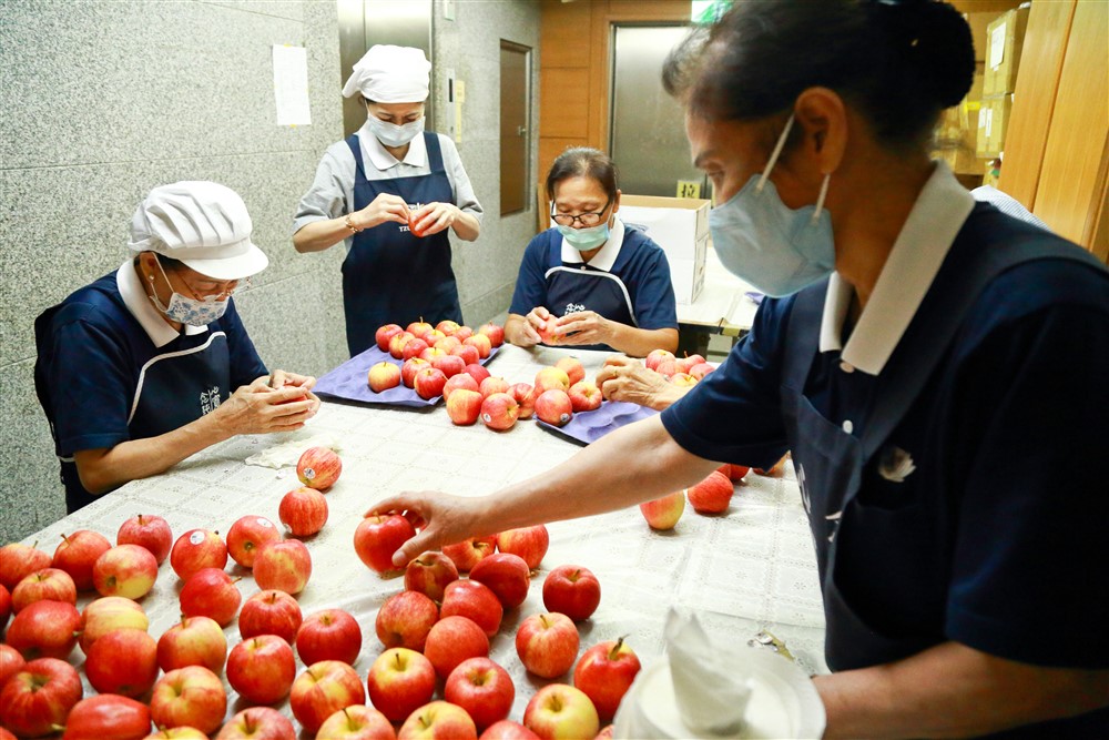 生活組志工仔細擦拭每一顆蘋果,祝福學員平安,收穫滿滿。攝影/孫保源
